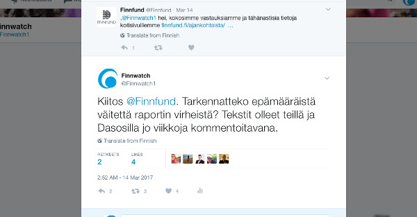 Finnfund vastasi Finnwatchille pitkälti samanlaisella tekstillä kuin minkä se julkisti myöhemmin 14.3. vastineenaan Finnwatchin raporttiin. Vastauksessaan Finnfund esitti saman Dasos Capitalin epämääräisen väitteen siitä, että Finnwatchin raportti sisältää virheitä. Vastasimme heti samana päivänä ja pyysimme lisätietoja mm. koskien väitteitä rahaston sijoituskohteen Hijauan Asian maksamista veroista. Erityisesti Finnfundia kehotettiin välittämään Finnwatchin tietoon raportissa olevat väitetyt asiavirheet.