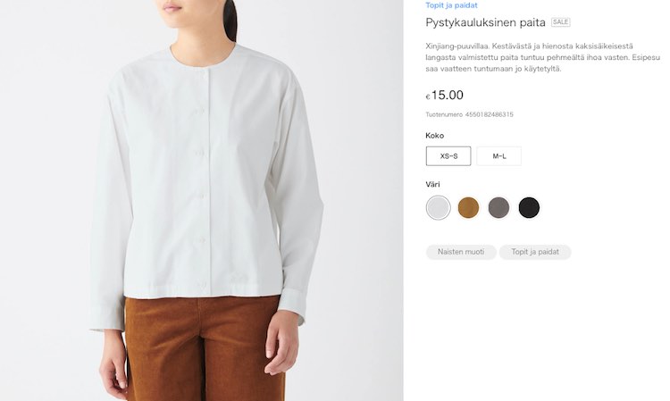 Toinen esimerkki on syksyllä 2019 kovalla tohinalla Suomeen rantautunut japanilainen lifestyle-brändi Muji, joka lanseerasi Xinjiang-puuvilla -vaatemalliston toukokuussa 2019. Xinjiangin uudelleenkoulutusleireistä nousseen kansainvälisen kohun keskellä lanseerattu uusi mallisto nostatti kulmakarvoja ympäri maailmaa. Tuotemerkintöjen perusteella ainakin osa malliston vaatteista on myös valmistettu Kiinassa. Niitä on ollut myynnissä myös Suomessa.