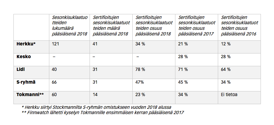 Finnwatchin sesonkisuklaiden vastuullisuutta koskeva kysely lähetettiin Keskolle, Lidlille ja Tokmannille. Kysely lähetettiin myös S-ryhmälle, jota pyydettiin toimittamaan tiedot erikseen Herkun ja S-ryhmän muiden myymälöiden osalta. Kaupan ketjuilta saadut vastaukset on koottu alla olevaan taulukkoon.